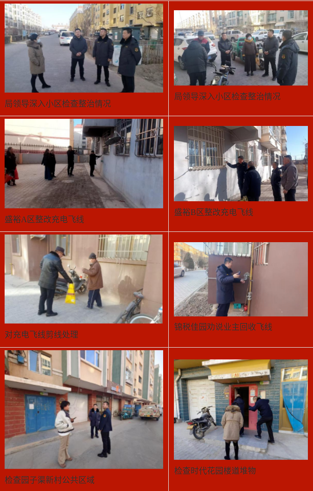 检查过程中,工作人员严格按照“边检查、边整改、边落实”工作要求,多措并举筑牢安全屏障。一是强化现场整治,对检查中发现的共用走道、楼梯间、安全出口等公共区域停放电动车、电动车入户充电、乱堆乱放杂物等安全隐患,现场责令物业服务企业立即开展集中清理整治,明确整治标准、压实整治责任,确保隐患及时清零。二是压实主体责任,现场核查物业服务企业24小时值班值守落实情况,要求企业设立应急报修值班电话,加大日常巡防巡查频次,规范报修接待和抢修流程,为业主提供高效便捷的应急服务,全力保障小区设施正常运行。三是严格闭环管理,对发现的飞线充电问题,责令物业立即通知业主回收,对无法及时回收的我局将联合消防部门依法进行剪线处置。