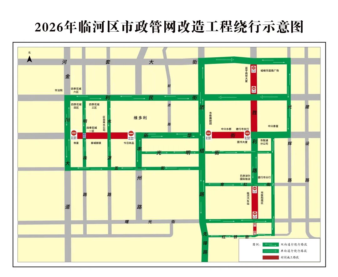 1.途经胜利路(利民街—新华街)路段、胜利路(河套大街—利民街)路段、胜利路(育红街—红铁街)路段的车辆,请绕行团结路、光辉路、建设路等周边道路。为方便居民出行,施工期间胜利路与河套大街路口、胜利路与利民街路口、胜利路与新华街路口、胜利路与育红街、胜利路与曙光街东西方可以正常通行,胜利路与永安街路口预留5米宽通道,仅供行人及电动车通行。如需封闭另行公告。