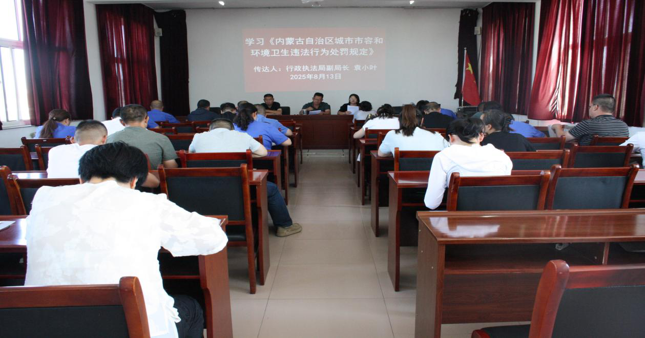 为进一步提升城市管理执法水平,规范执法行为,加强城市市容和环境卫生管理,8月13日,磴口县城市管理综合行政执法局组织全体干部专题学习《内蒙古自治区城市市容和环境卫生违法行为处罚规定》。