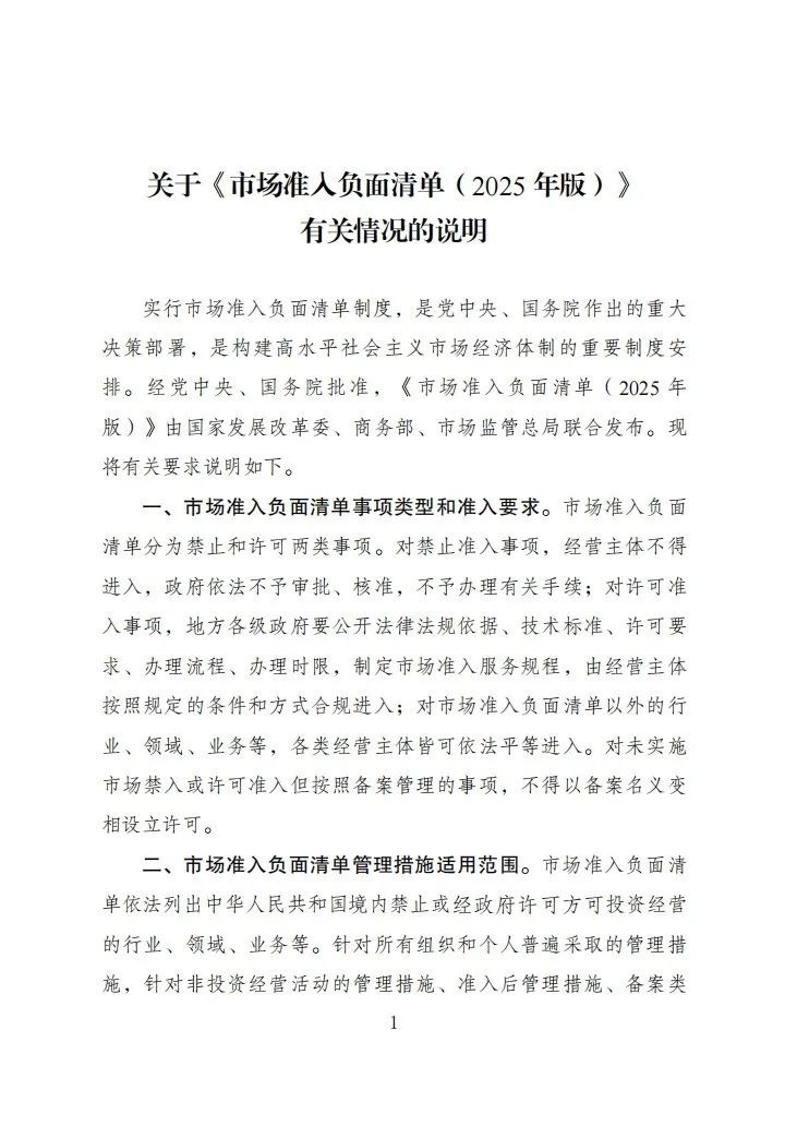 《市场准入负面清单(2025年版)》已经党中央、国务院批准,自即日起印发实施,请结合实际认真贯彻落实。2022年3月12日发布的《市场准入负面清单(2022年版)》(发改体改规〔2022〕397号)同时废止。